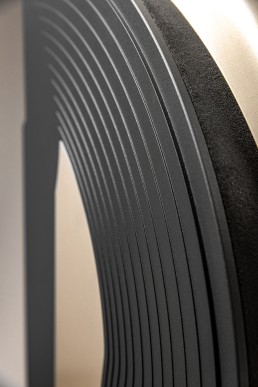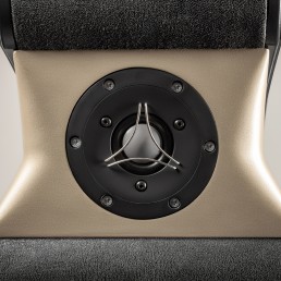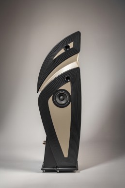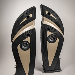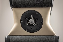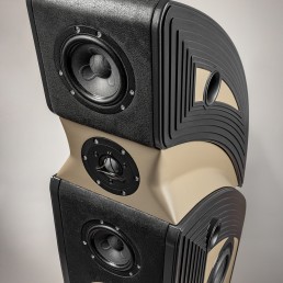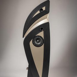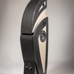 Inspired by the silhouette of a harp, the cabinet blends form and function. The stone-like exterior dampens resonance naturally, while the curved aluminum base ensures both stability and heat dissipation. The elegant form integrates effortlessly into high-end interiors. The Element 5 expands this form to accommodate a more powerful internal structure and extended driver system.